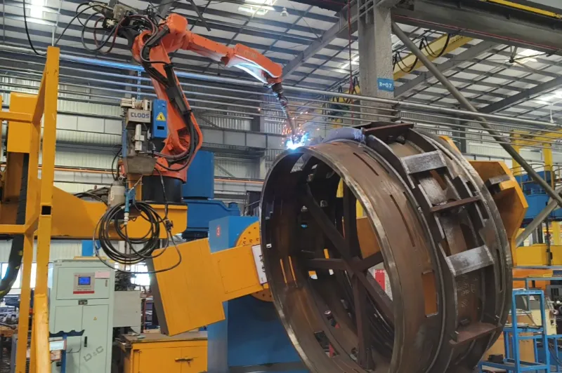 AGR delivered a high-precision robotic welding system tailored for 5-ton wind turbine stator and rotor parts. The station features: